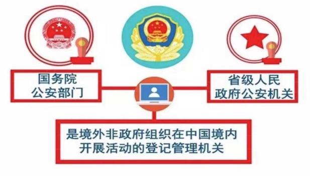 省级人民政府公安机关是境外非政府组织在中国境内开展活动的登记备案管理机关。县级以上人民政府公安机关和有关部门在各自职责范围内对境外非政府组织在中国境内开展活动依法实施监督管理、提供服务。
