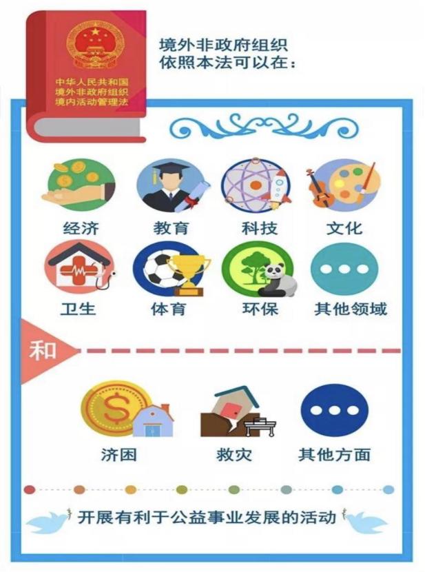 境外非政府组织可以在经济、教育、科技、文化、卫生、体育、环保等领域和济困、救灾等方面开展有利于公益事业发展的活动。