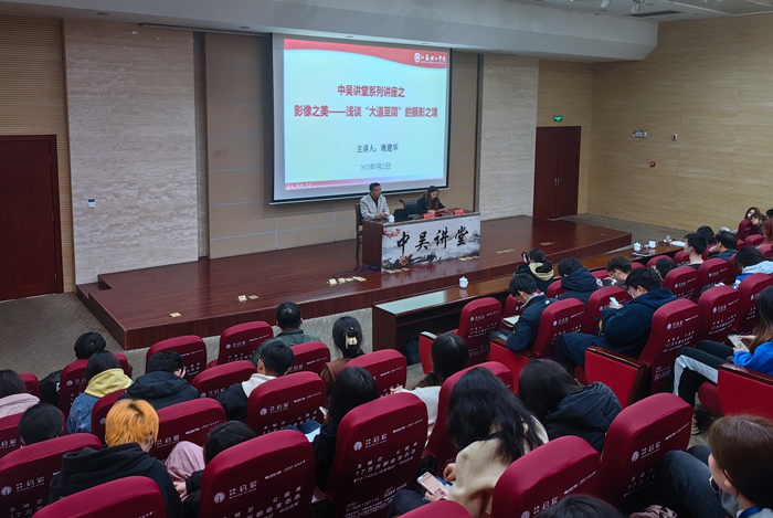 3月22日下午,我校在图书馆南报告厅举办“中吴讲堂”主题讲座,资深摄影人姚建华应邀作《影像之美——浅谈“大道至简”的摄影之境》专题讲座。讲座由党委宣传部副部长、新闻中心副主任靳婷婷主持,各二级学院、校大学生通讯社120余名师生代表现场聆听了讲座。