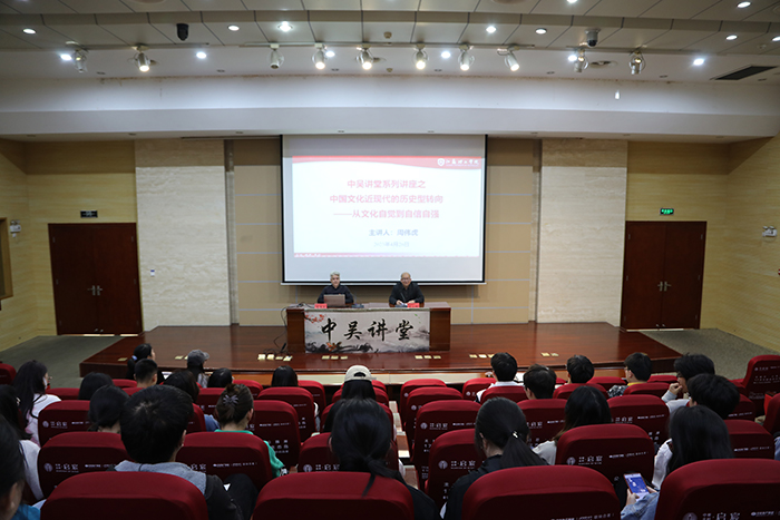 4月26日下午,我校在图书馆南报告厅举办“中吴讲堂”主题讲座。文化学者、苏州大学马克思主义学院兼职教授周伟虎应邀作《中国文化近现代的历史型转向——从文化自觉到自信自强》专题讲座。全校师生代表近100人现场聆听了讲座。讲座由马克思主义学院副院长刘小刚主持。