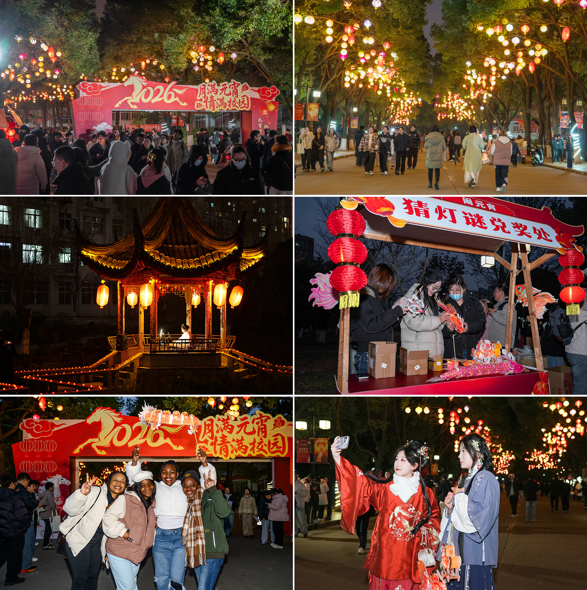 现场设置了赏灯游园、灯谜竞猜、汉服打卡、古筝演奏等环节,从行知路至凌波桥,以龙门架作为活动起点,沿线灯笼高挂,道路两侧道旗展示元宵传统习俗。灯谜竞猜环节采用线上线下相结合的方式,线上通过校园网、微信公众号同步上线猜谜小程序,线下设置二维码打卡点,师生可随时随地参与互动、解锁民俗乐趣。
